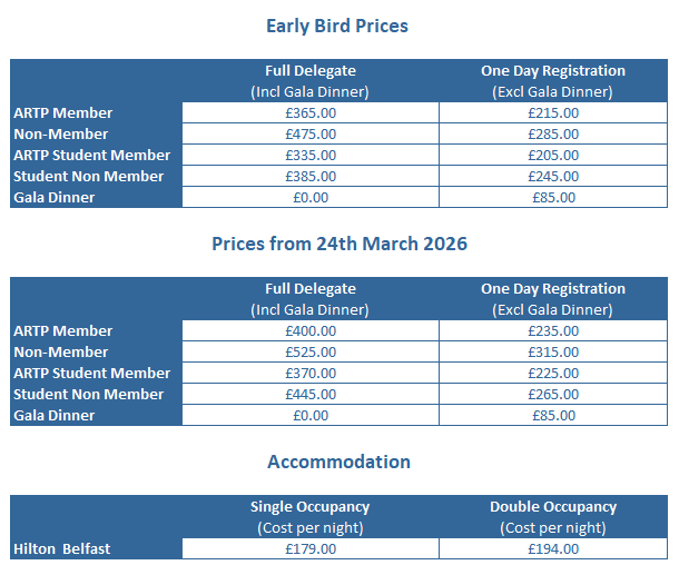 The below information details how your data will be used in relation to the ARTP 2026 conference. Please use the following link for more information on the privacy policy, ARTP Privacy Policy - please read these before continuing.